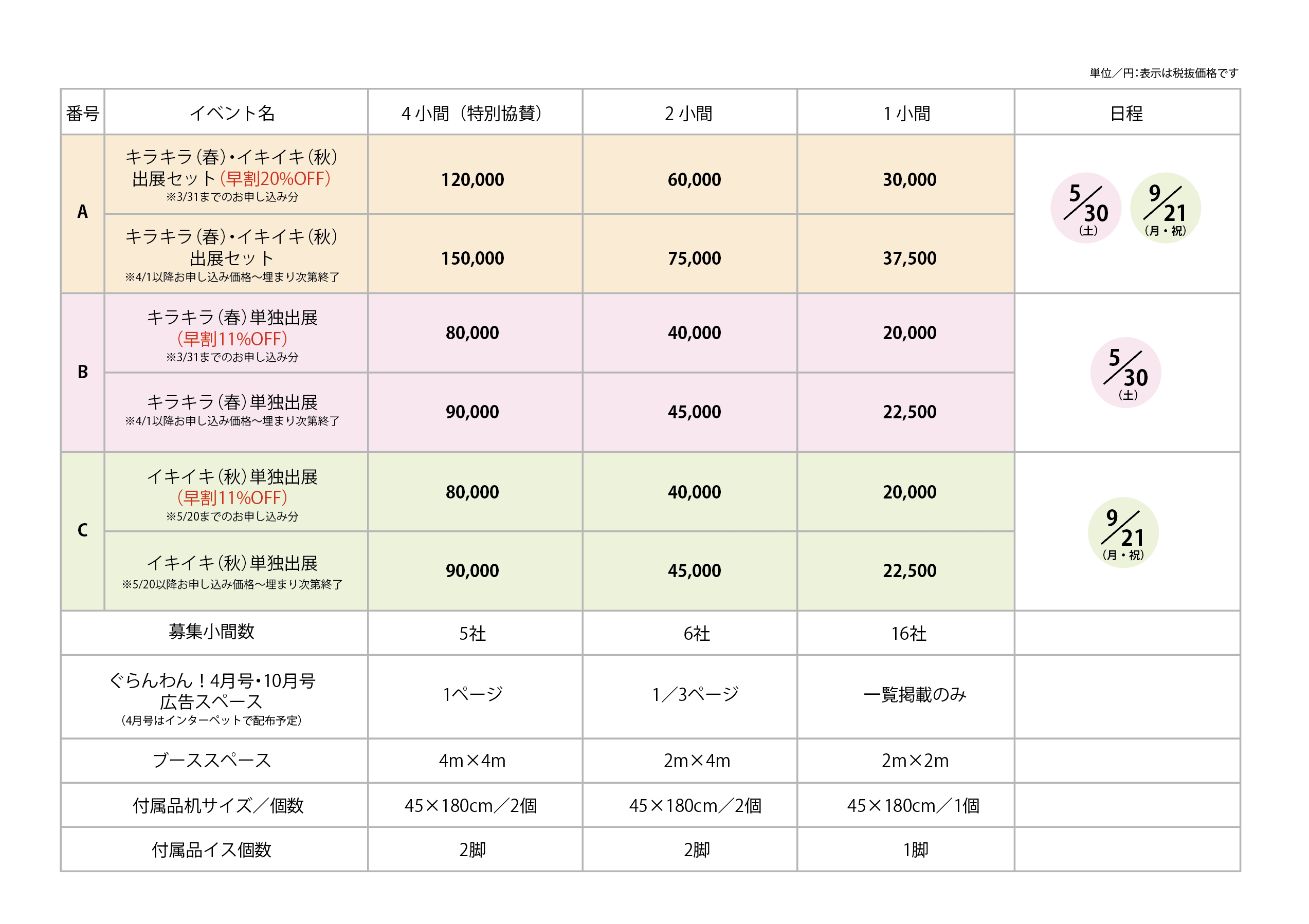 出展料金は、ブースサイズおよび出展内容により異なります。料金には、基本ブース使用料および運営管理費が含まれます。